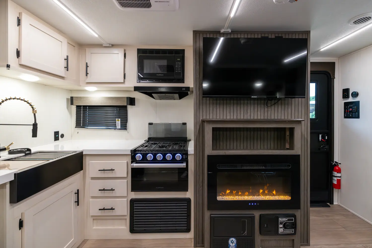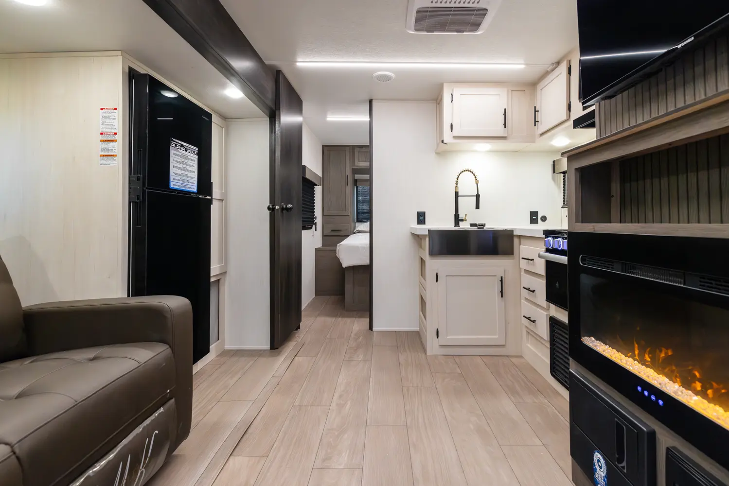 Meet the Alpha Wolf 22SW by Forest River; a lightweight 27ft travel trailer that's PACKED with big amenities! Relax in the theatre seats directly across from your cozy fireplace and entertainment center. There's also a removable table that connects to the sofa when it's time for a meal. The kitchen features a walk-in pantry, 12-volt refrigerator, farm style sink, oven, microwave and lots of storage. In the rear is a full bathroom and up front you'll find a queen bed and two wardrobes.