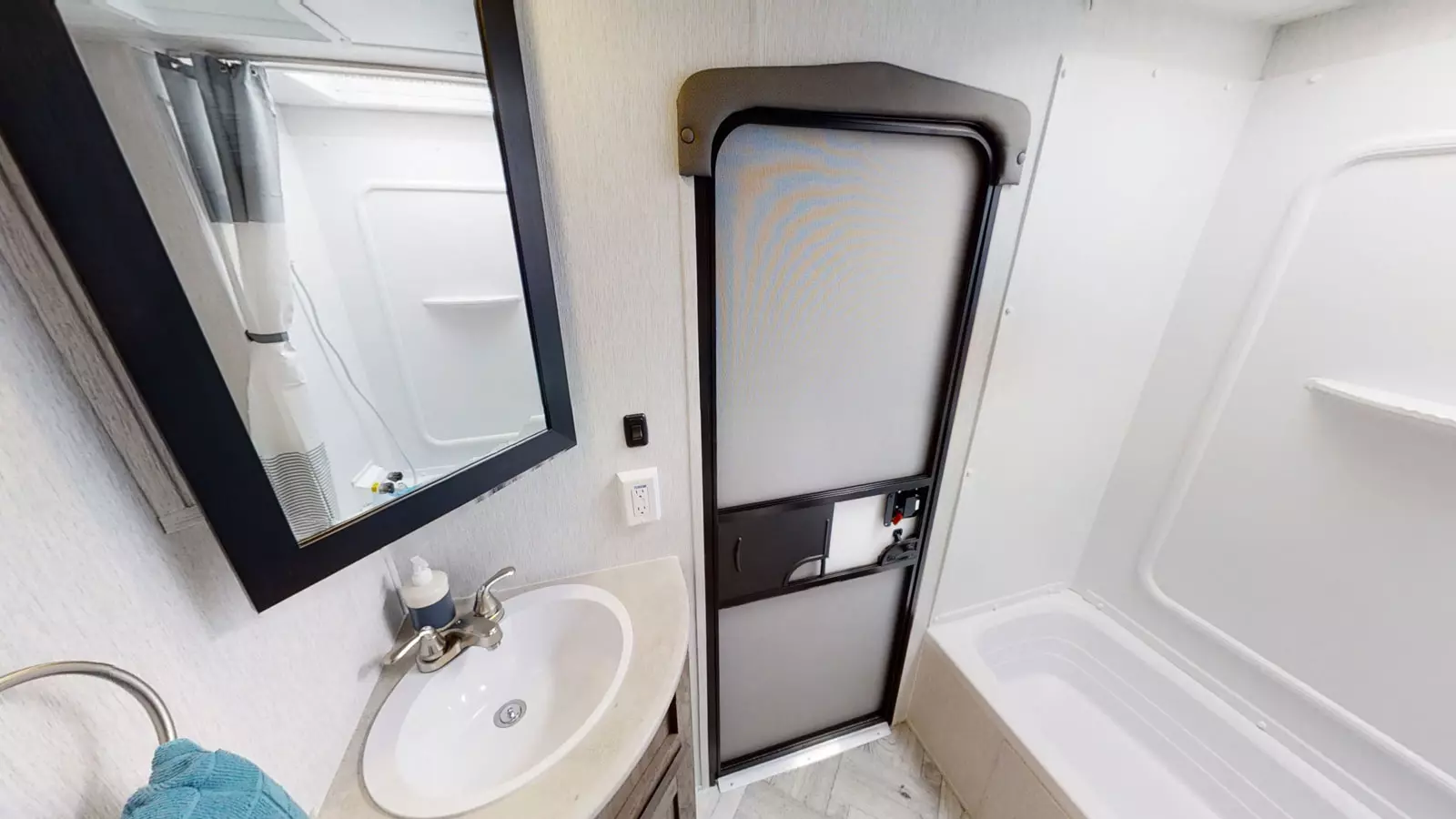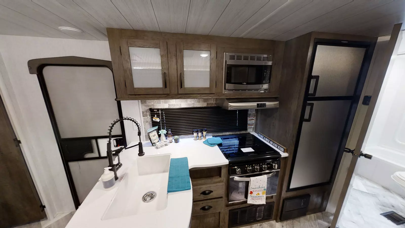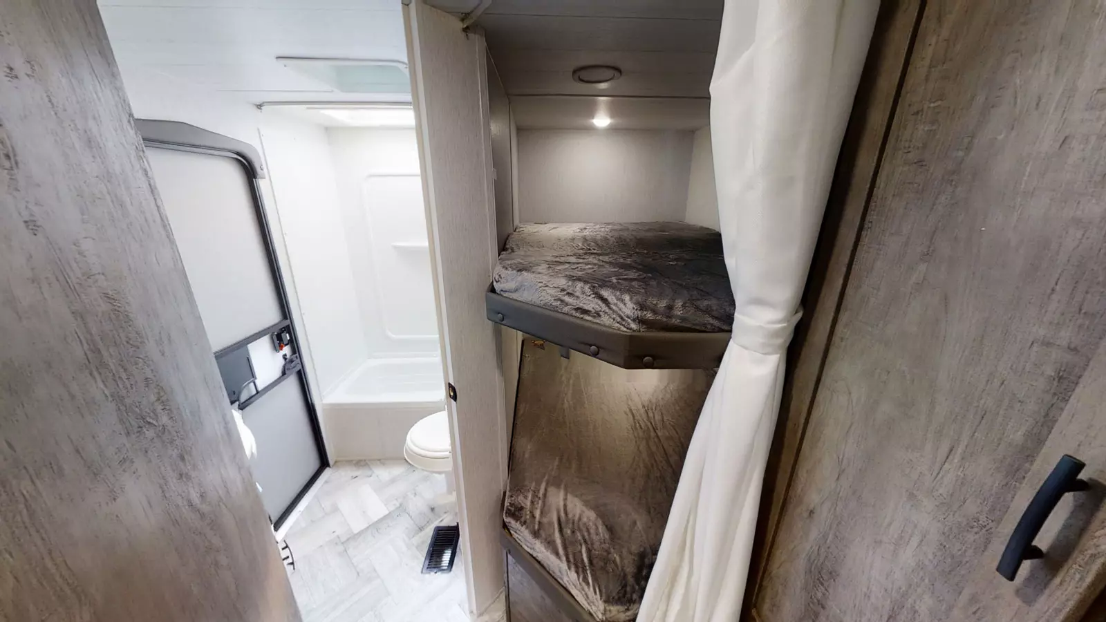 The T2490 has one slideout and two entries. Exterior features front storage, and an awning. Interior layout front to back: RV king bed with shelf above and wardrobes on each side, and hamper on door side; entertainment center along inner wall; door side entry, peninsula kitchen counter with sink wraps to door side with overhead cabinet, microwave, cooktop and refrigerator; off-door side slideout with u-dinette, and a pantry; rear off-door side double bunk beds; rear door side full bathroom with second entry.
