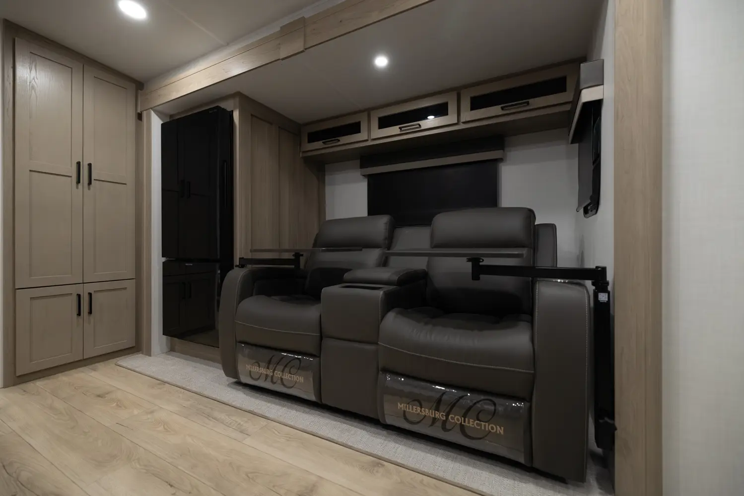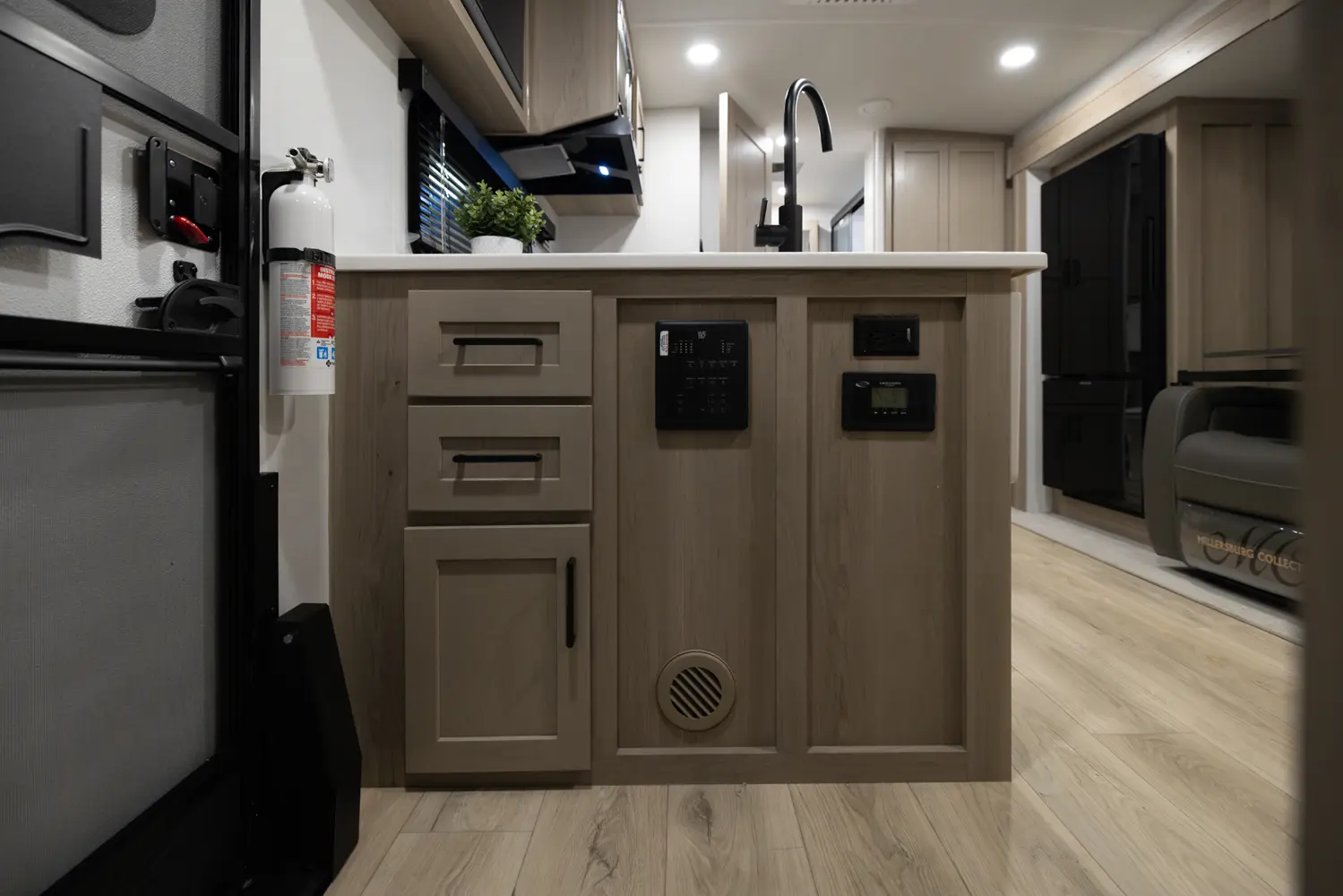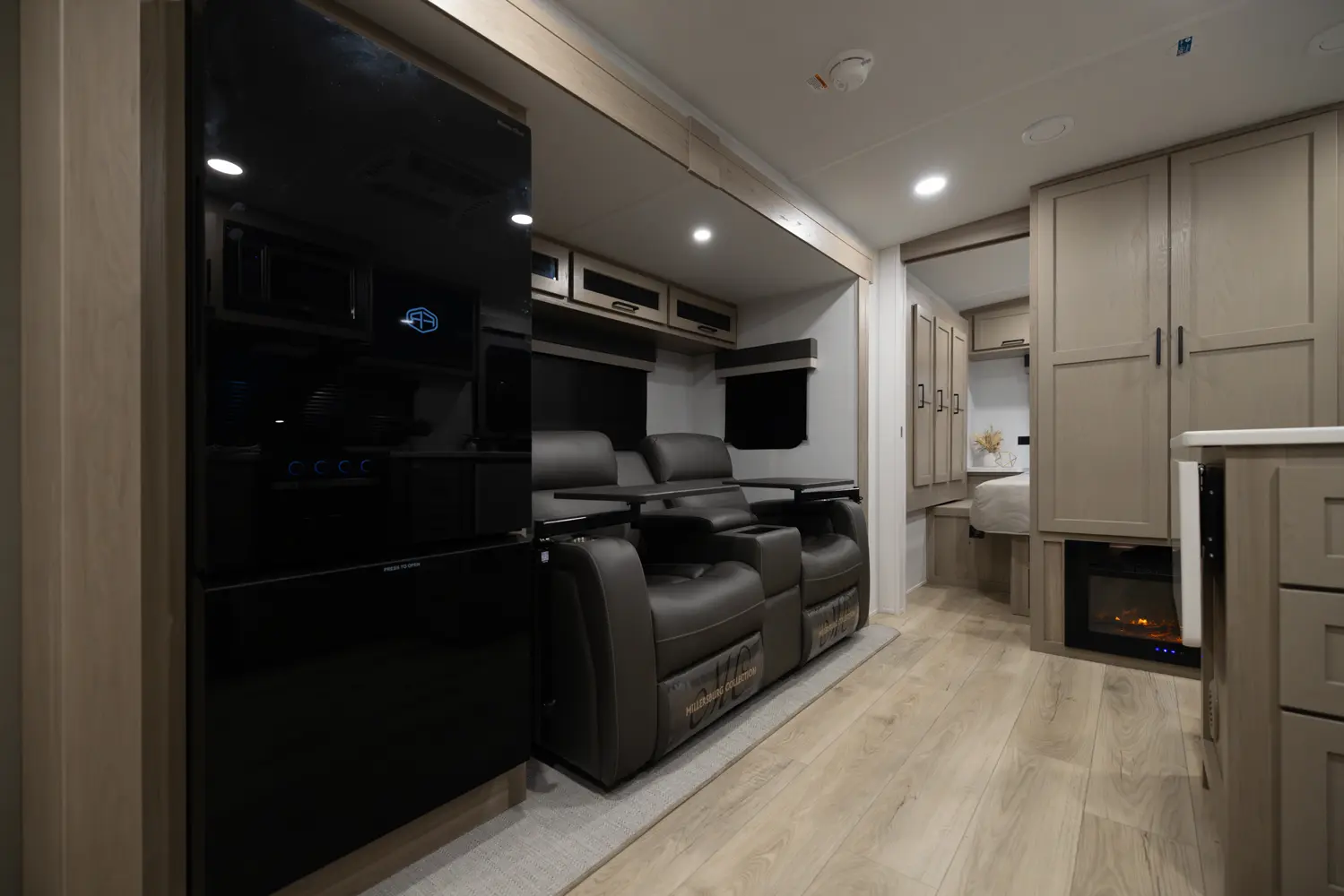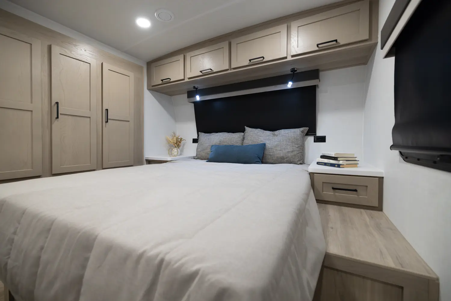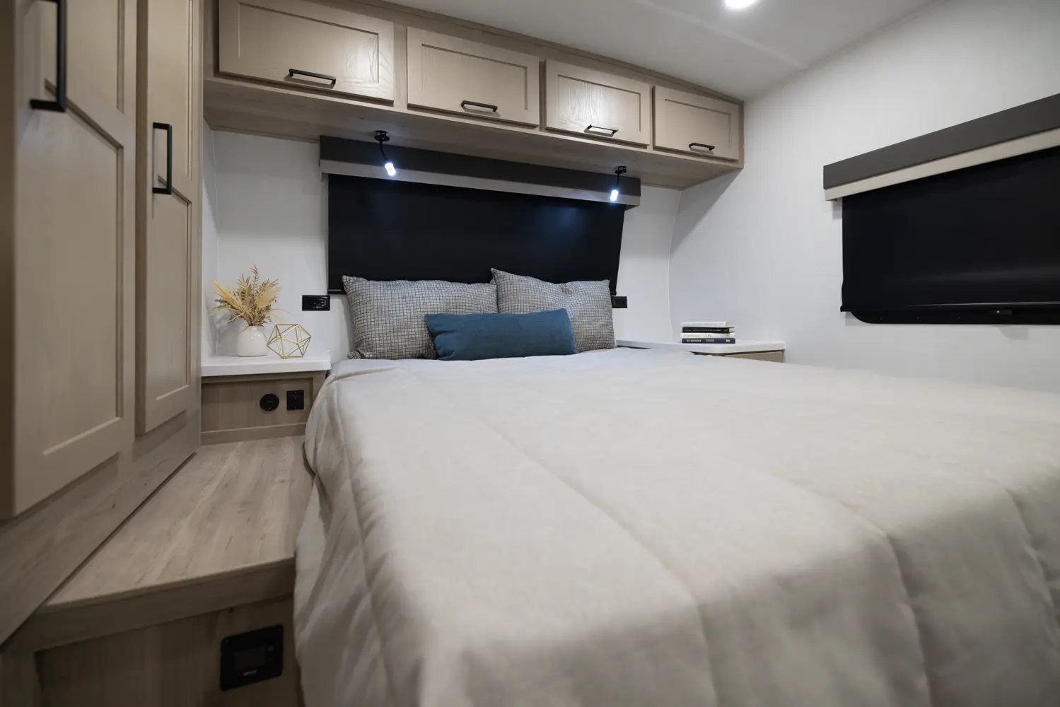 The outside kitchen on this Flagstaff Micro Lite featuring our new griddle, a refrigerator and grill makes cooking so enjoyable and flexible. No need to take the smell of cooking bacon inside. The large wardrobe slide makes packing and organization so easy. The large pantry next to the bathroom covers all your kitchen storage needs as well. The center position of the television in your entertainment spaces makes viewing from any part of the living quarters easy.