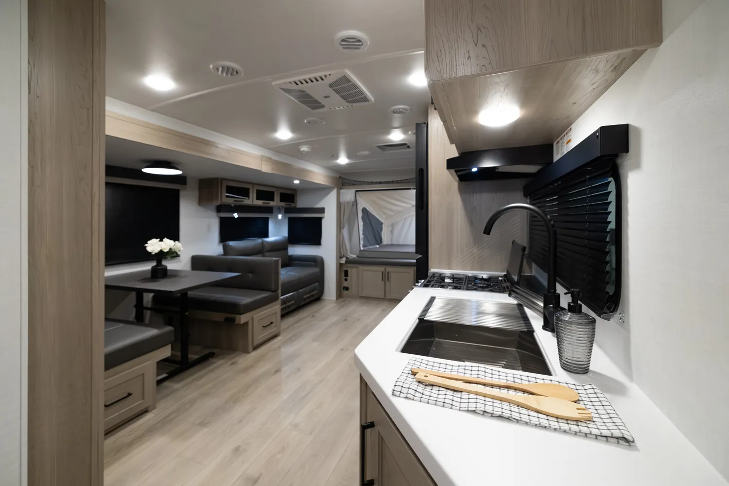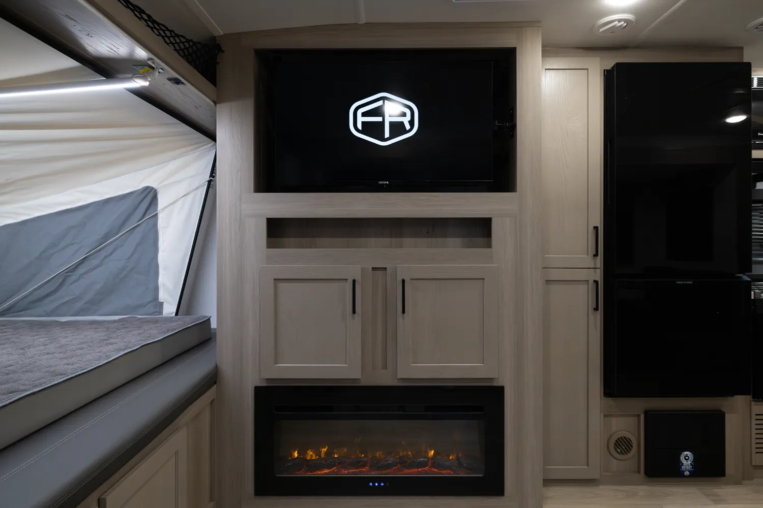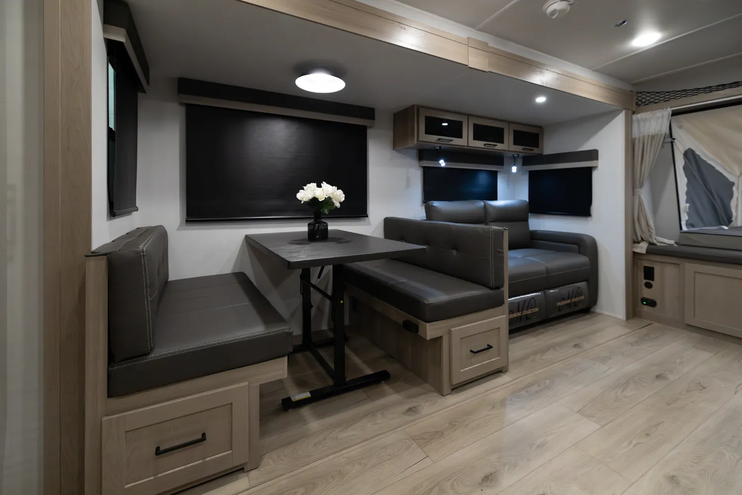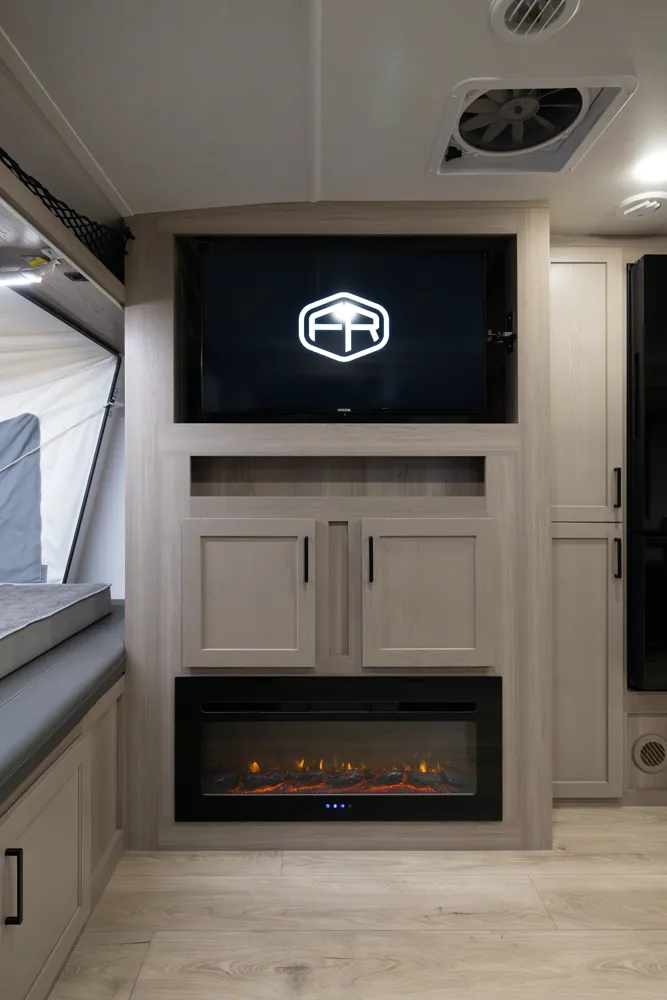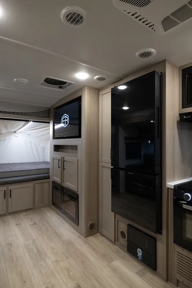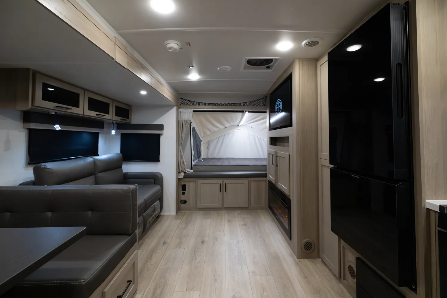 The highlight of this expandable travel trailer is the large slide on the off camp side with a sofa dinette. The sofa is directly across from the entertainment center and fireplace which are incredible features that make you feel right at home. If you want an expandable travel trailer with the fireplace, you will love this coach.