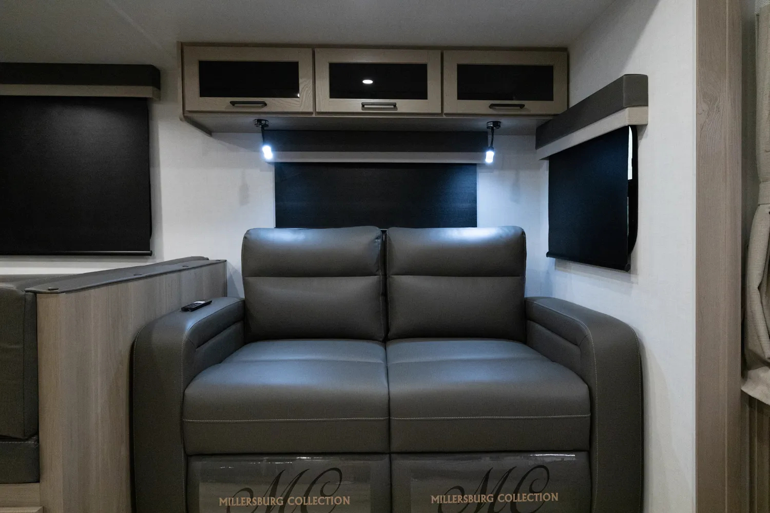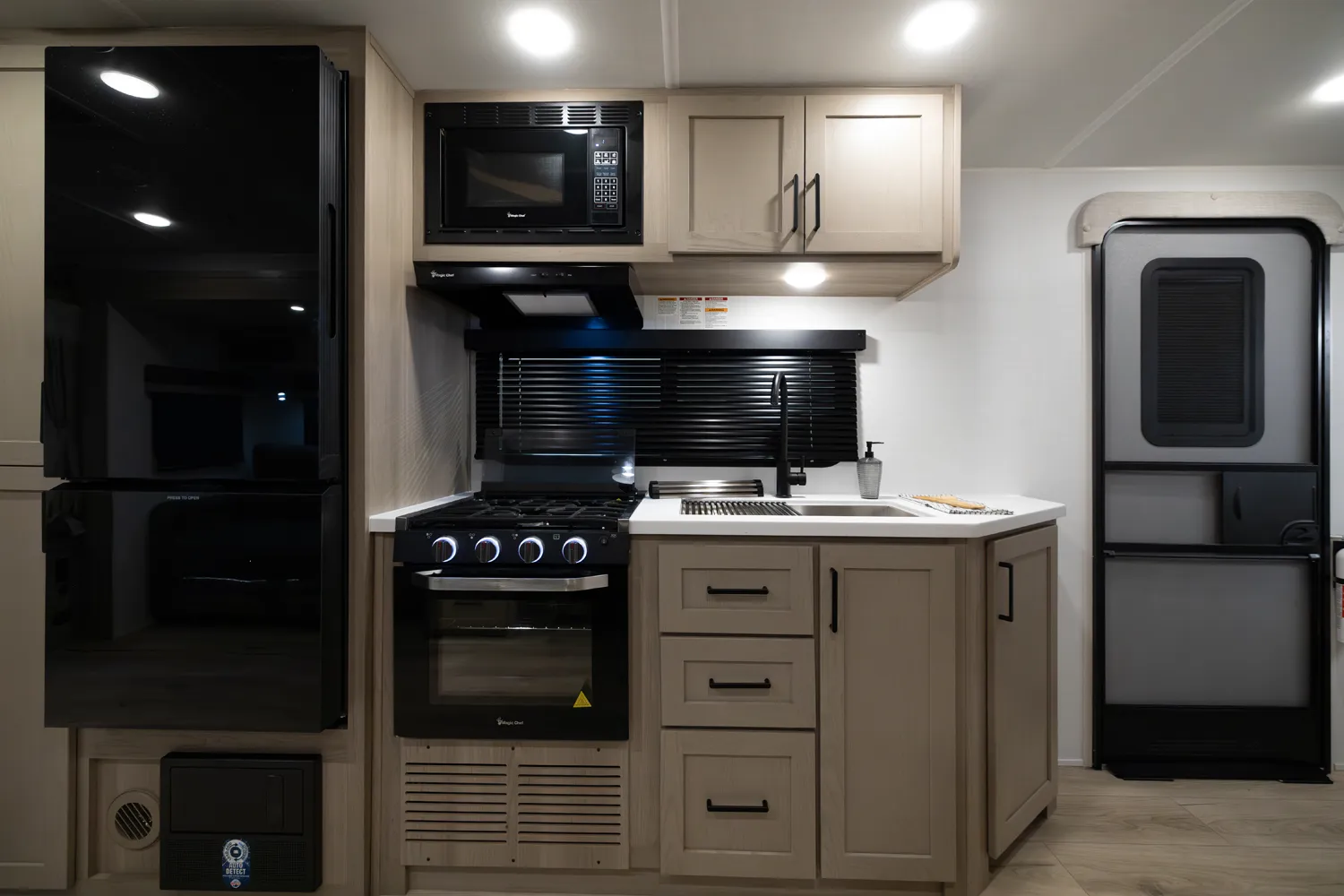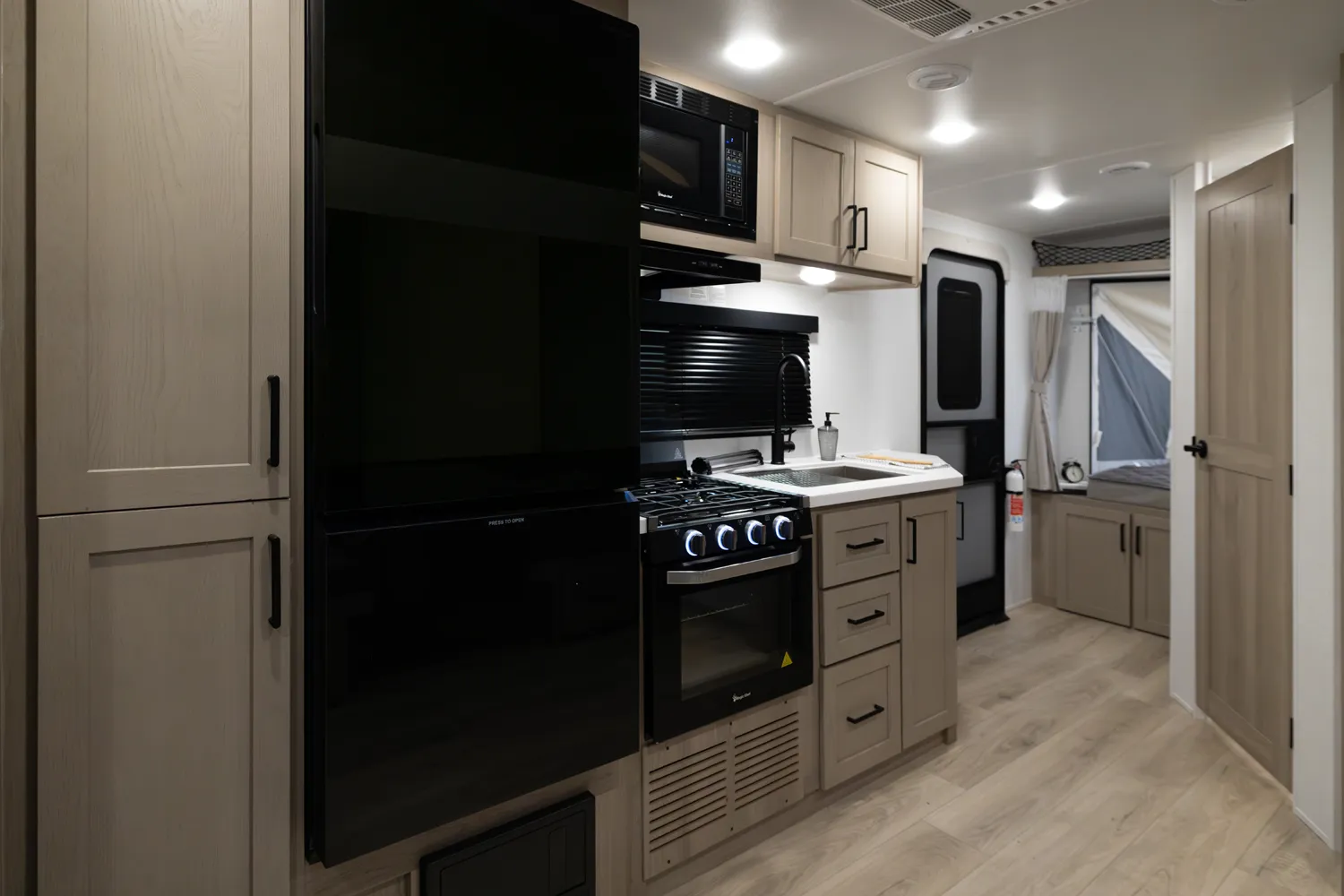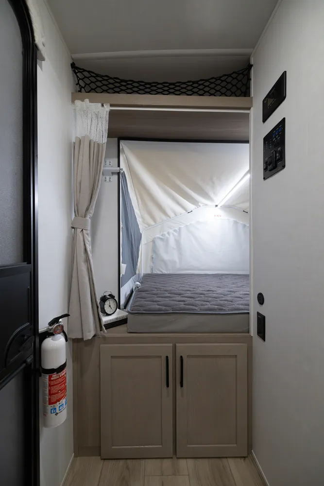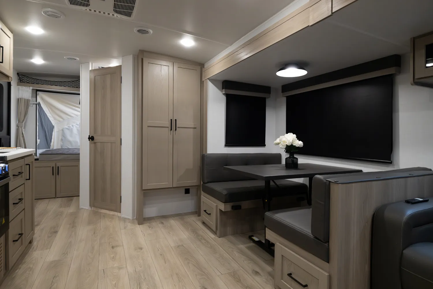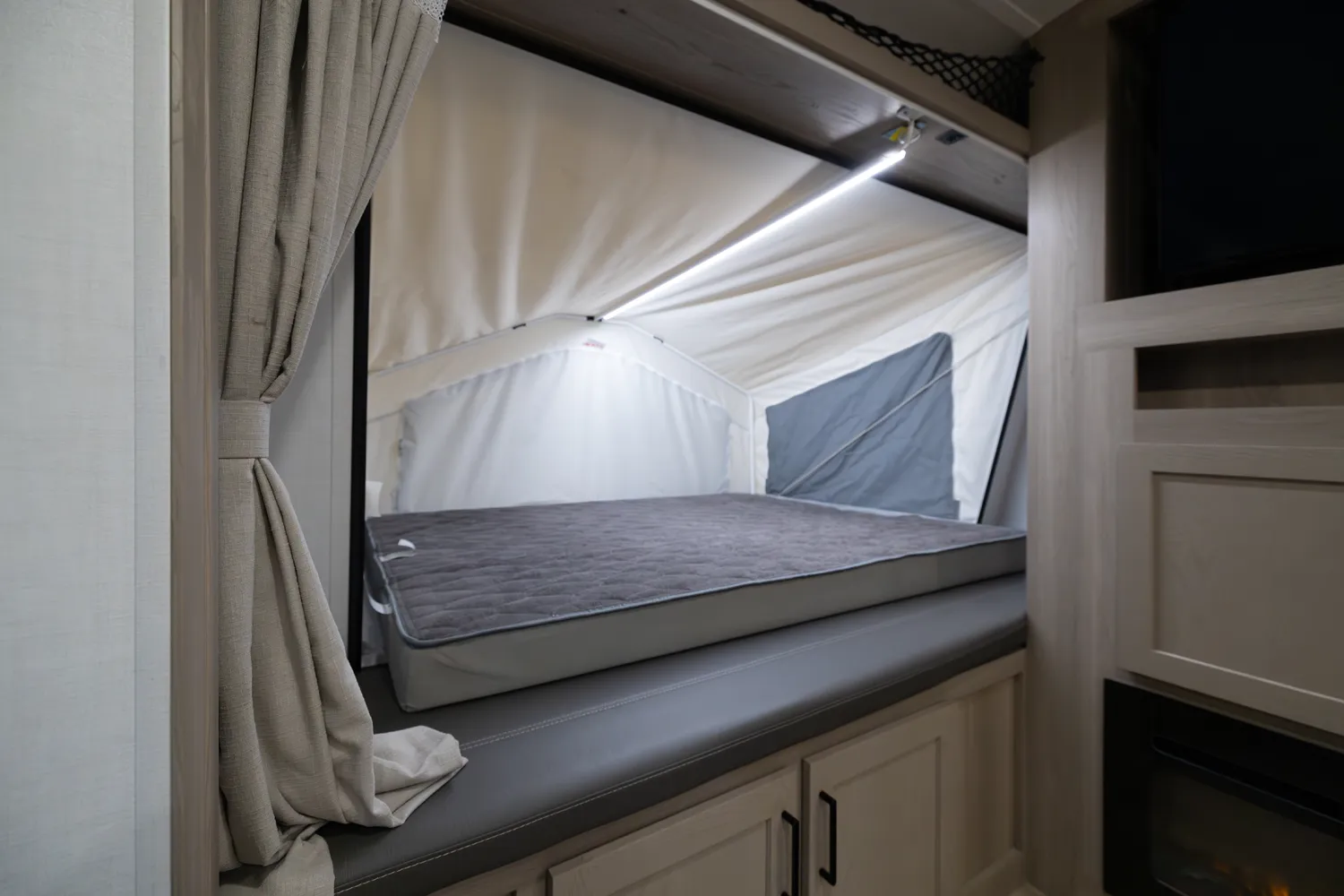 The highlight of this expandable travel trailer is the large slide on the off camp side with a sofa dinette. The sofa is directly across from the entertainment center and fireplace which are incredible features that make you feel right at home. If you want an expandable travel trailer with the fireplace, you will love this coach.