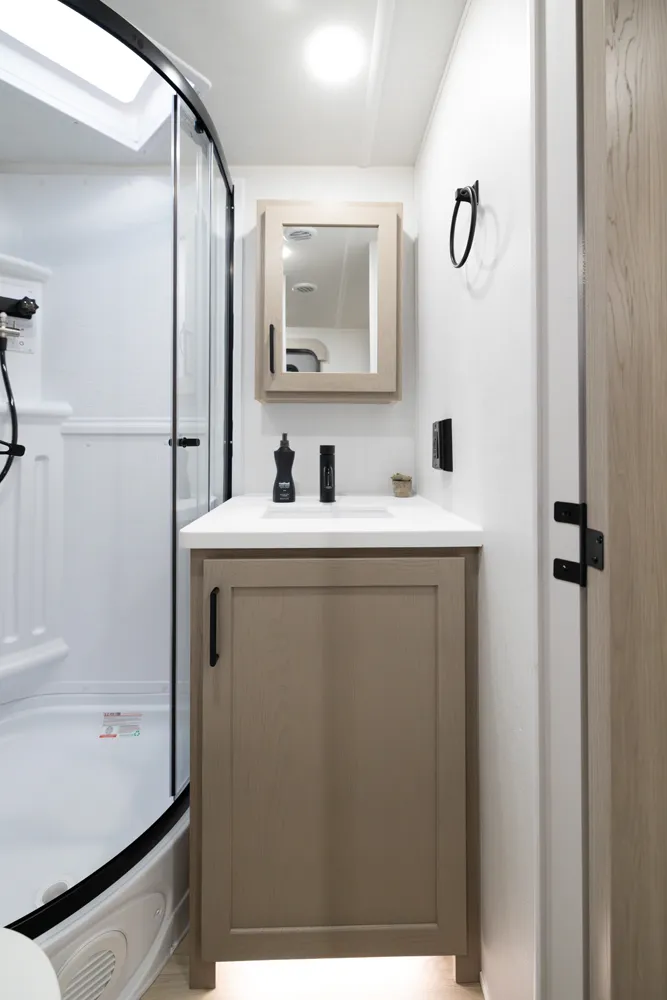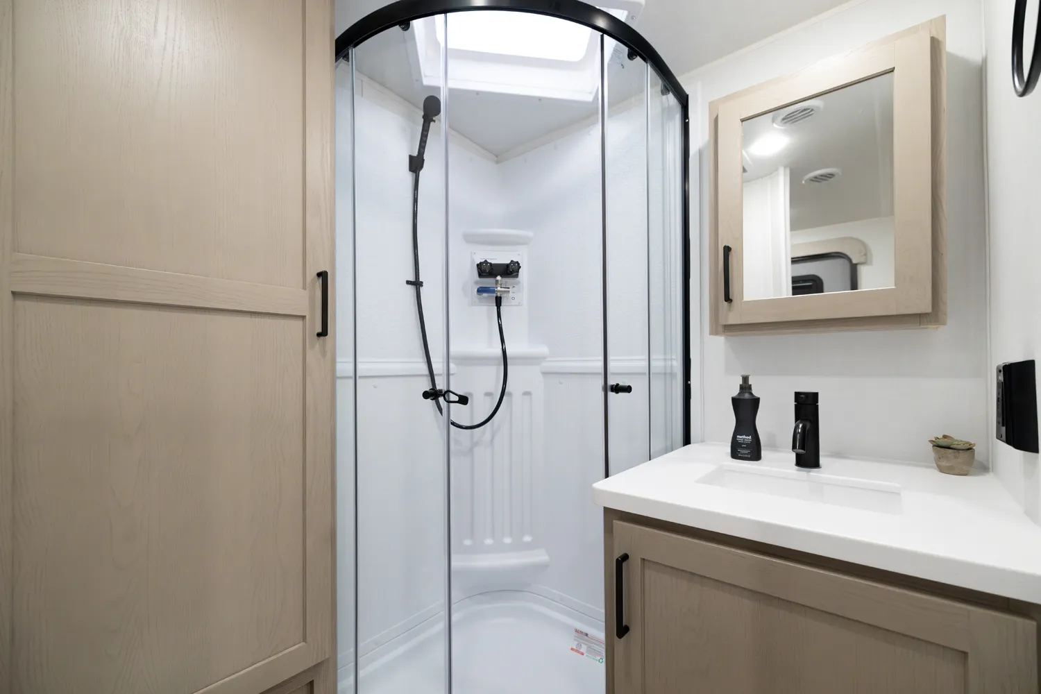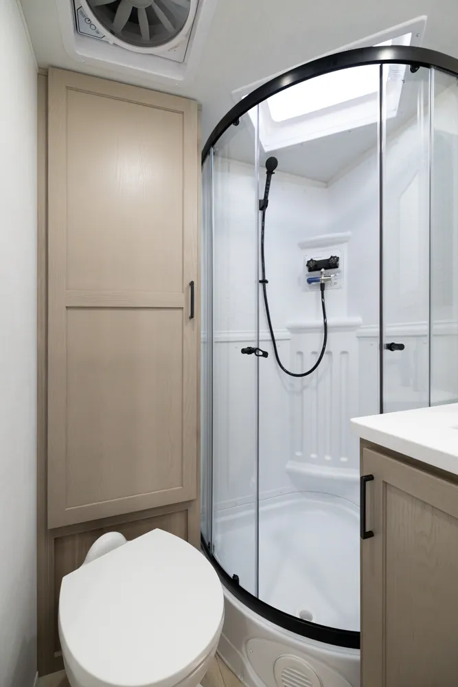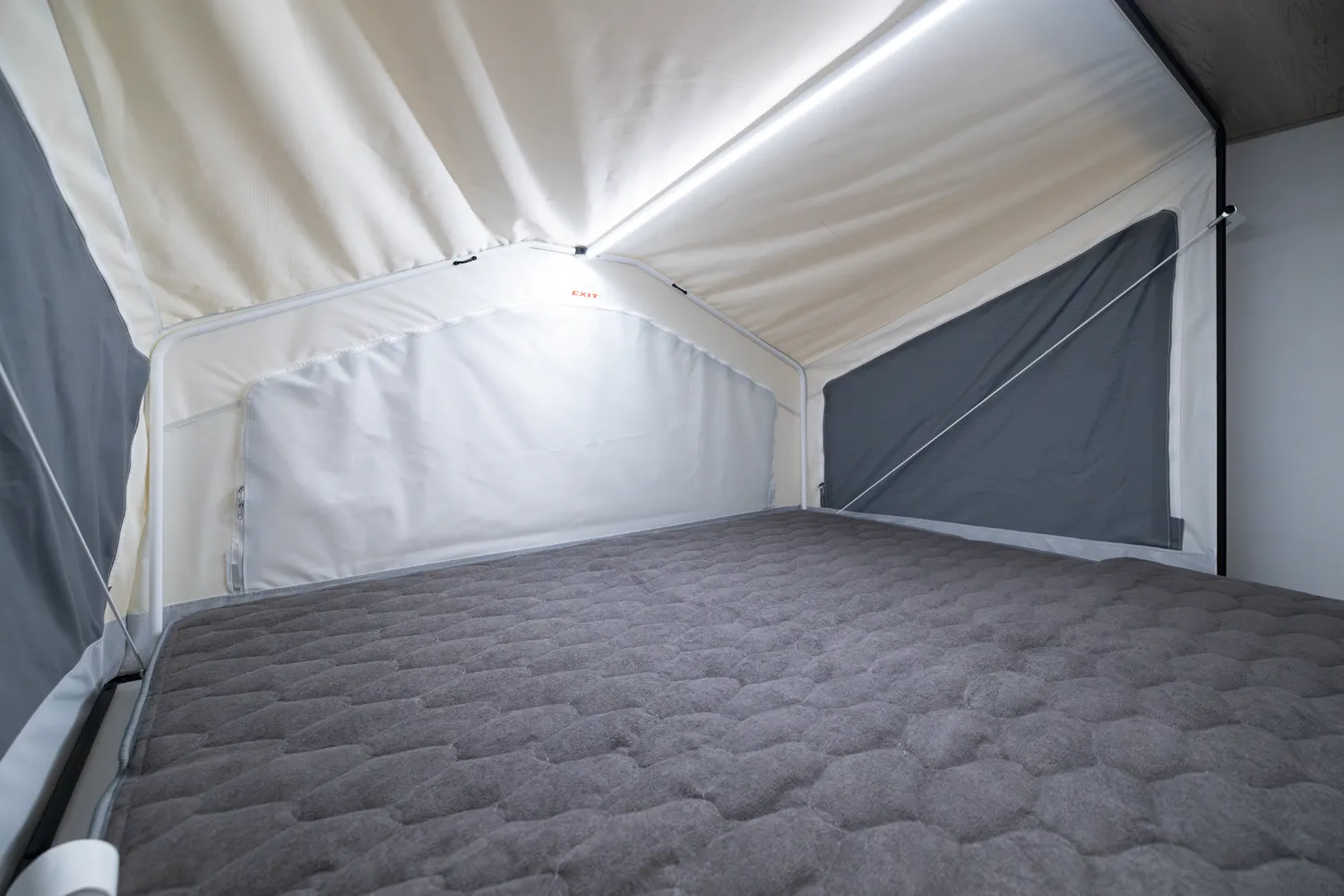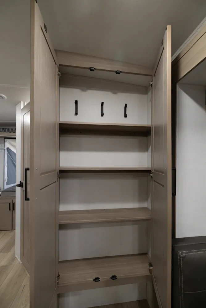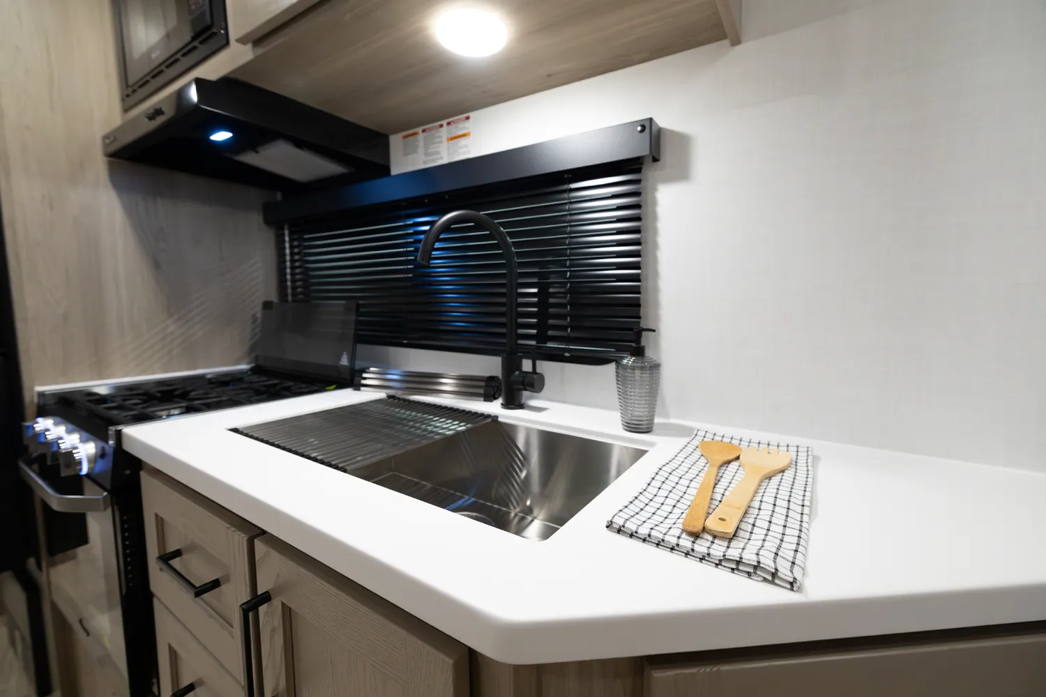 The highlight of this expandable travel trailer is the large slide on the off camp side with a sofa dinette. The sofa is directly across from the entertainment center and fireplace which are incredible features that make you feel right at home. If you want an expandable travel trailer with the fireplace, you will love this coach.