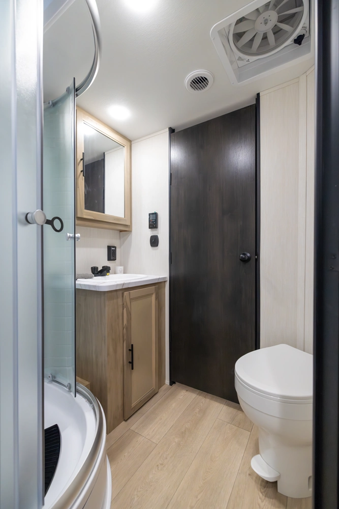 The Cherokee Grey Wolf 22RR by Forest River is the ultimate RV for outdoor enthusiasts. The spacious toy hauler garage, with a convertible rear ramp, provides ample space for toys and gear. The outdoor kitchen, shower, and patio area offer a luxurious outdoor living experience. Inside, you'll find a comfortable bedroom with a walk-around queen bed and a well-appointed bathroom. The modern kitchen, with its black stainless steel farm sink and sink cover, is perfect for cooking and entertaining.