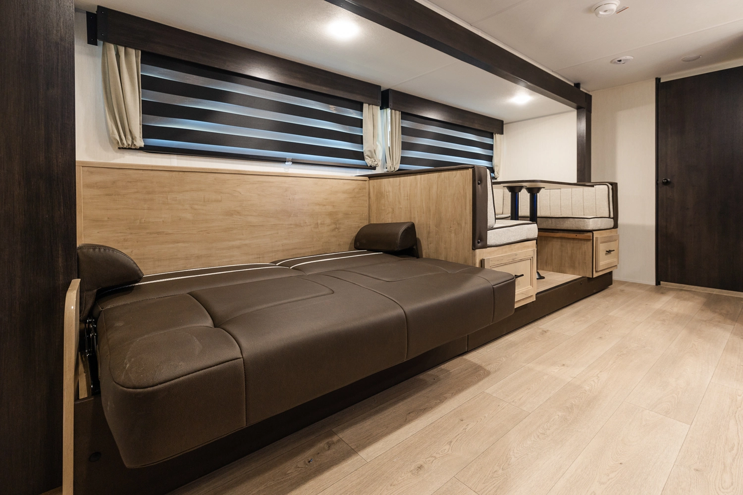 The Cherokee Grey Wolf 26LK by Forest River offers a spacious and luxurious layout in a compact 32-foot package. The living room and full bathroom provide comfort and convenience, while the rear bedroom, featuring a king-size bed and ample wardrobe space, offers a peaceful retreat. The well-equipped kitchen, with a large 12-volt refrigerator, air fryer combo microwave, and utility sink, is perfect for cooking and entertaining. Experience the comfort and style of the Cherokee Grey Wolf 26LK!