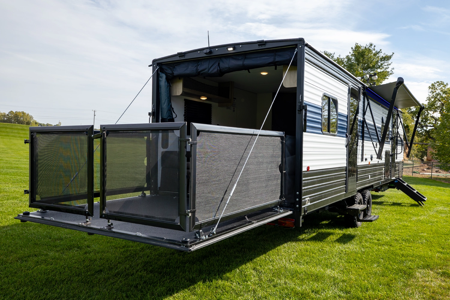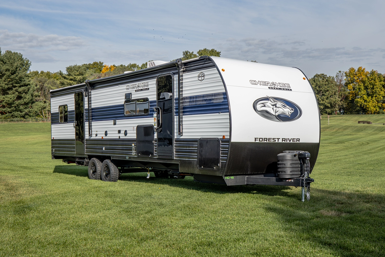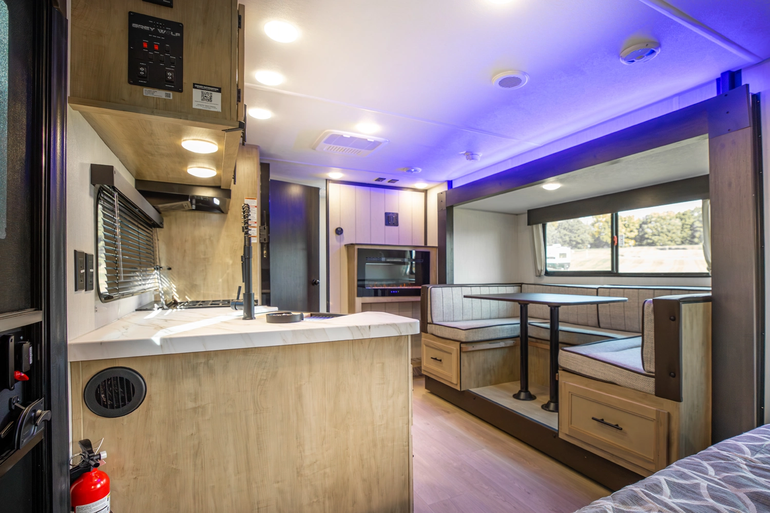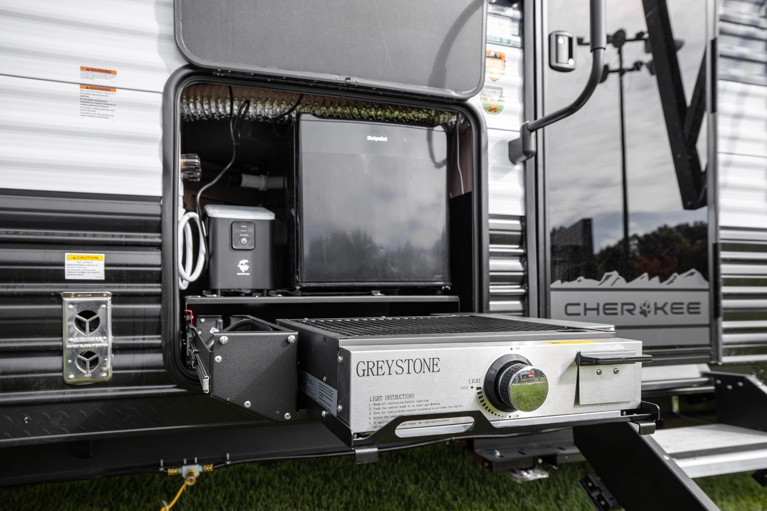 The Cherokee Grey Wolf 27RR by Forest River is a luxurious travel trailer that offers a unique camping experience with a ramp door that doubles as a patio. The private 11-foot toy hauler garage, convertible into a sleeping area, is perfect for storing toys, bikes, or other gear. The outdoor kitchen, complete with a shower, speakers, TV hookup, and a rear ramp-turned-patio, is ideal for outdoor entertaining. The bedroom, with a queen-size bed and a full bathroom, provides a peaceful retreat.
