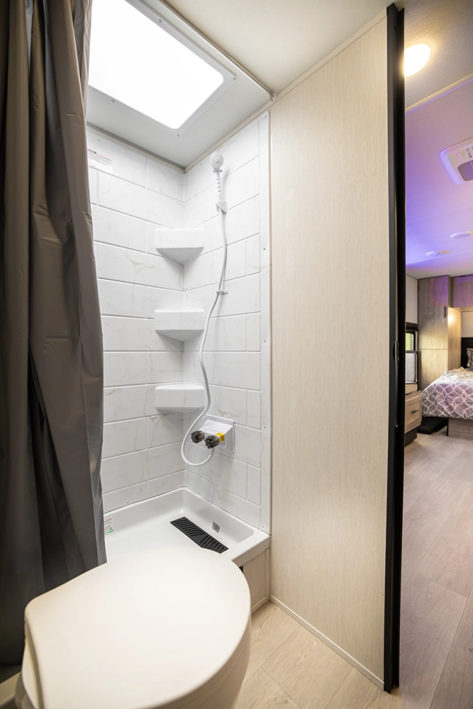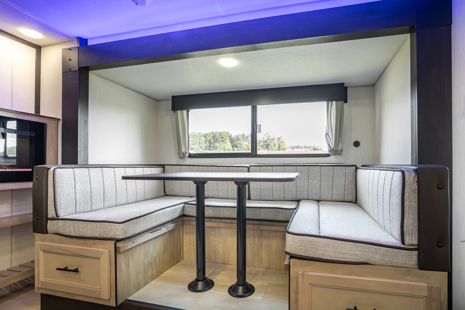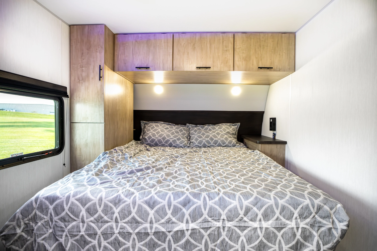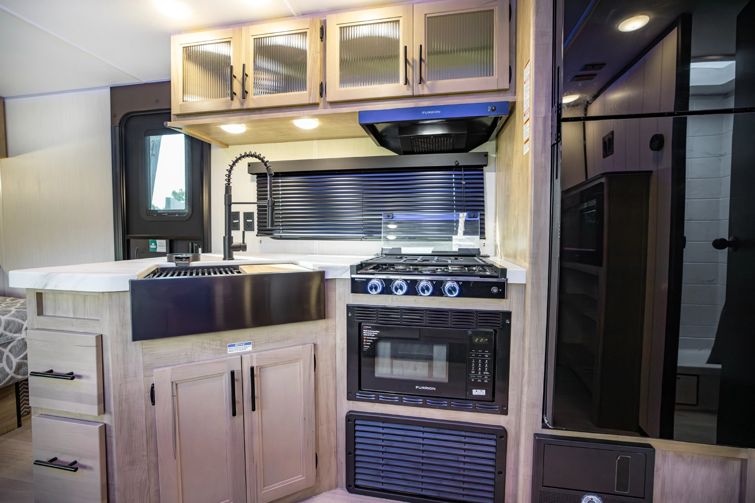 The Cherokee Grey Wolf 27RR by Forest River is a luxurious travel trailer that offers a unique camping experience with a ramp door that doubles as a patio. The private 11-foot toy hauler garage, convertible into a sleeping area, is perfect for storing toys, bikes, or other gear. The outdoor kitchen, complete with a shower, speakers, TV hookup, and a rear ramp-turned-patio, is ideal for outdoor entertaining. The bedroom, with a queen-size bed and a full bathroom, provides a peaceful retreat.