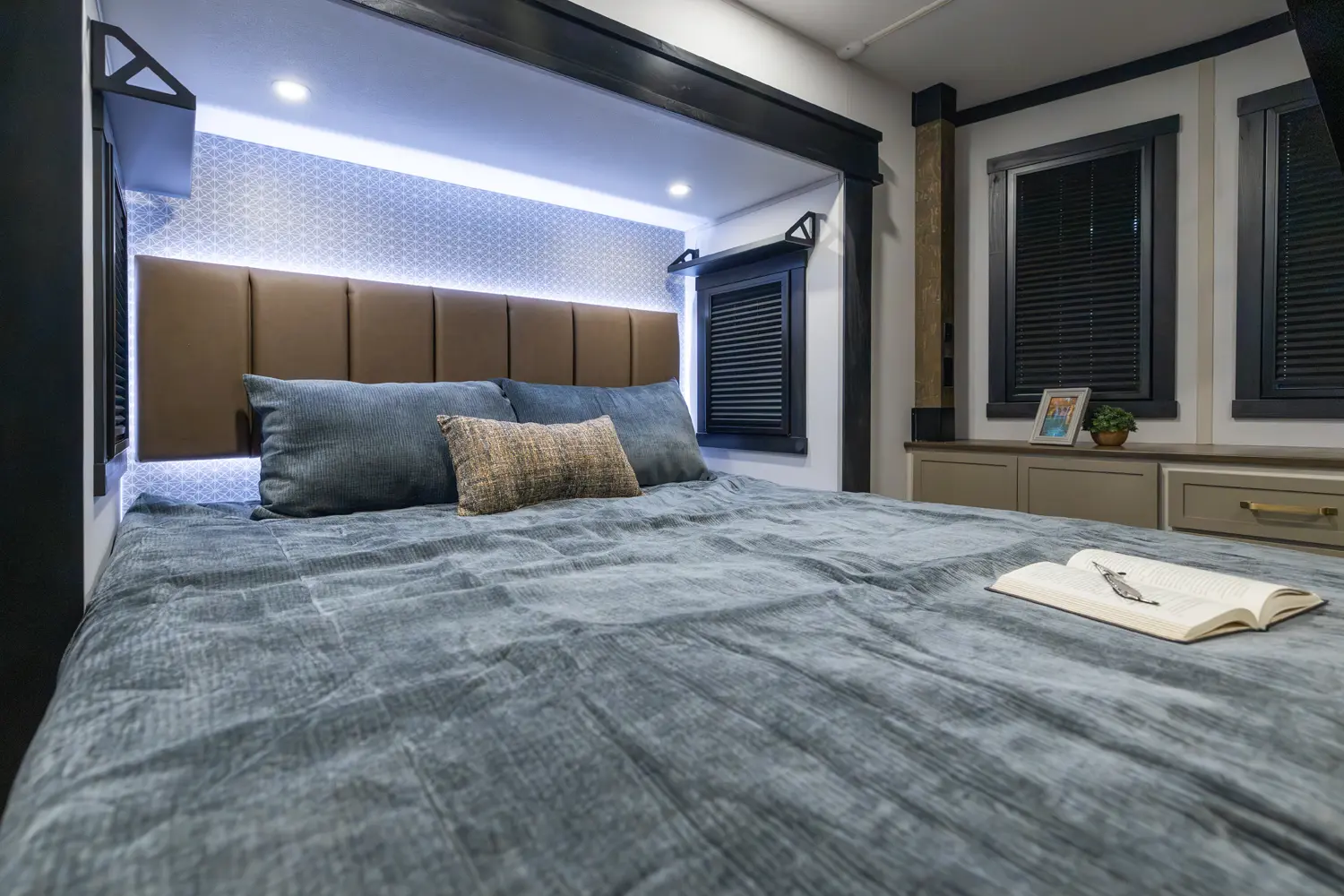 • Leuvered Openings Above Custom King Bed Loft