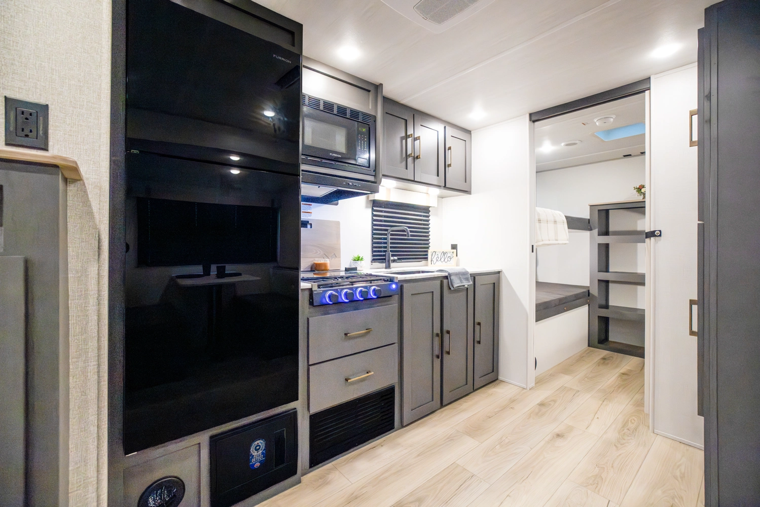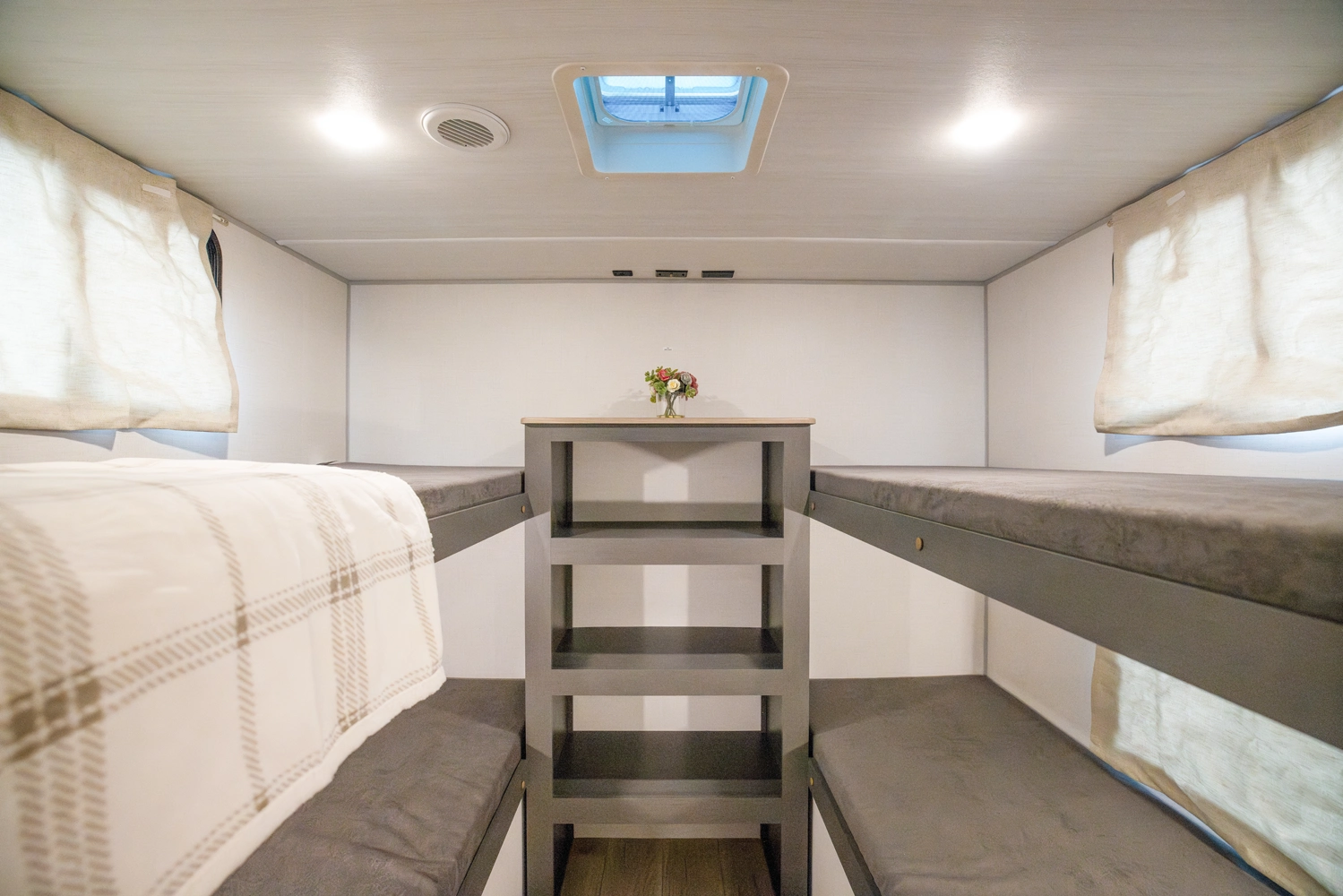 The Ibex New Trail Edition TRAIL28 features a front queen bed, central living area with sofa and dinette, a full kitchen, and a walk-through bath. A private rear bunk room offers four bunks and extra storage. Includes washer/dryer prep, tankless water heater, 50-amp service, and designed with superior construction.