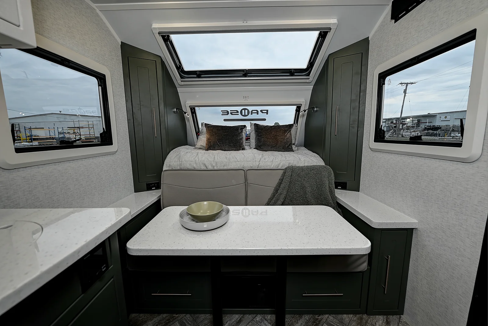Bring the whole family along with this floorplan! A full size queen bed on the front of this trailer, along with two bunk beds in the rear grants comfortable sleeping for everyone. Make sure you get all your work done while on the road with an entertainment center and a desk below you can utilize for a work station. Cooking can be done with ease on the interior, or exterior of this floorplan. Exterior storage can be found in the rear garage and below the bottom bunk bed on the exterior.