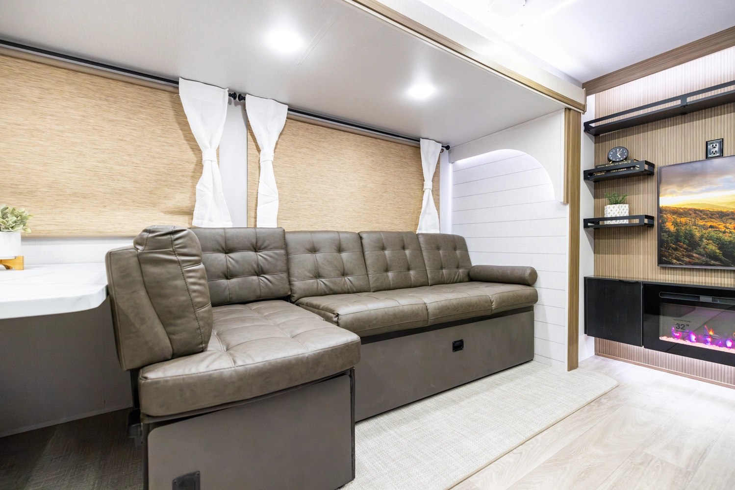 The 32BHDS is the ultimate bunkhouse, with two total slide outs and an outside kitchen. This well-equipped travel trailer features oversized panoramic windows, the ever-popular U-dinette, which you can customize with the adjacent Versa-Lounge. The kitchen includes a 11 CU. FT. refrigerator and stovetop with oven and LED accents, plus cabinets for all your cooking essentials!