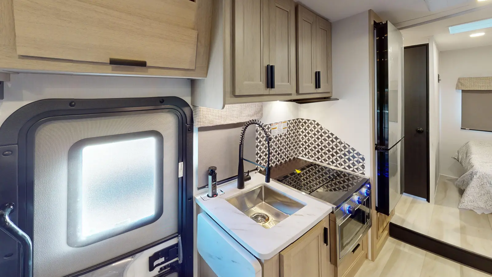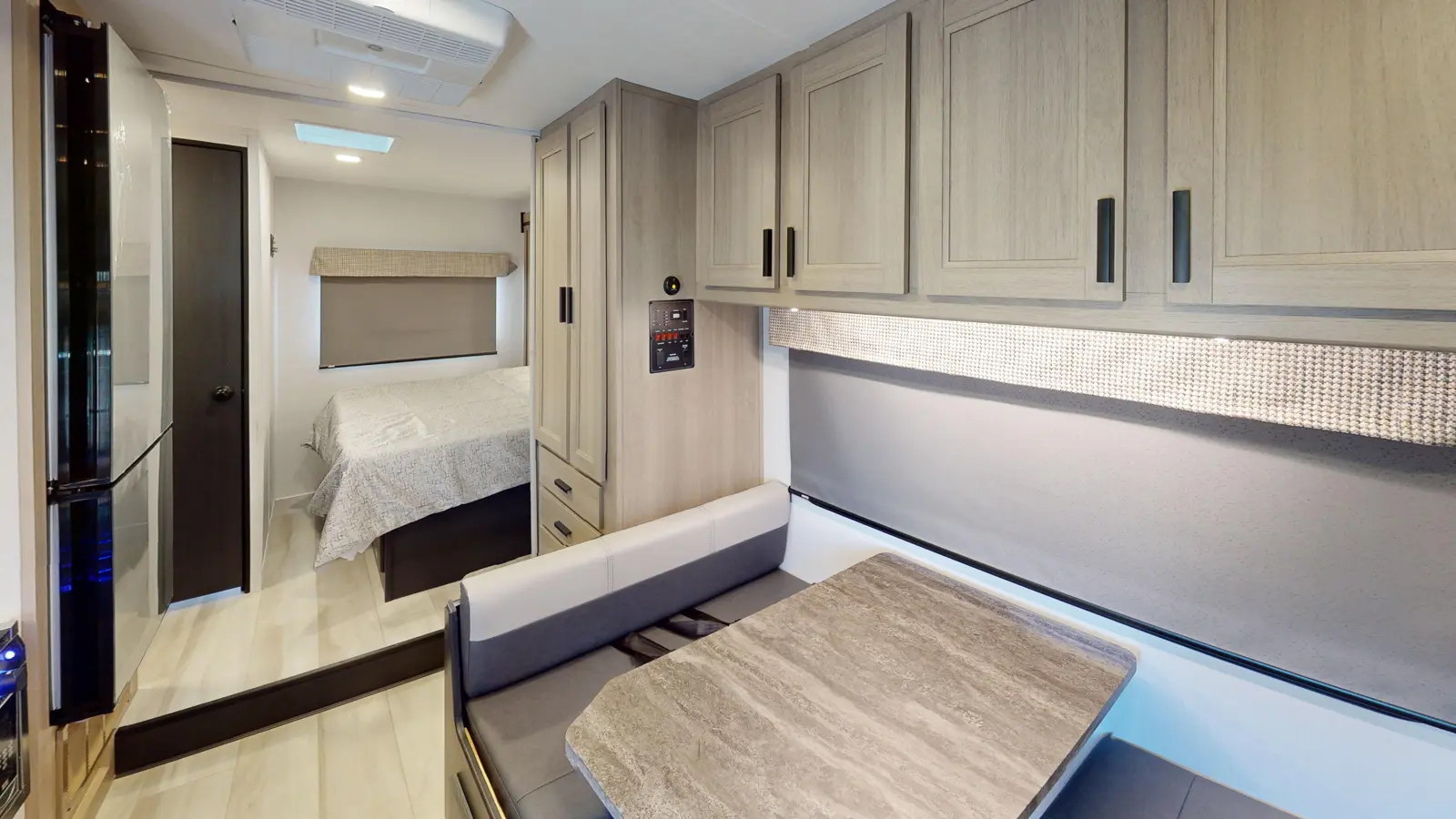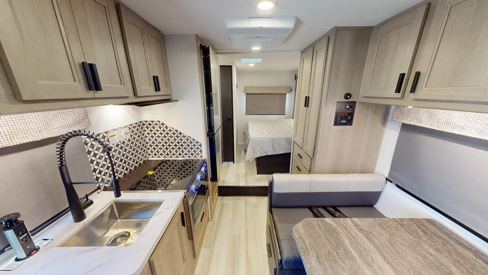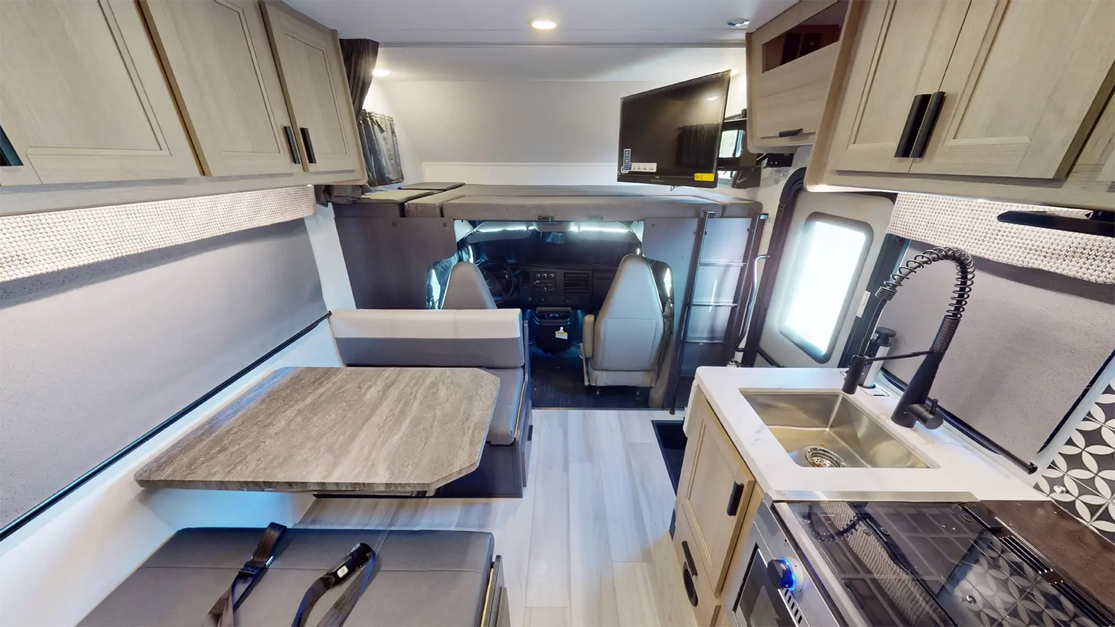 This 2250SLE is built on a Chevy 3500 or Ford E350 chassis. There is a rear bedroom with slideout and a 60" x 80" wedge mattress for enhanced sleep. The main living area includes a kitchen with 12V refrigerator, booth dinette, cooktop, convection microwave, and sink with a flip-up counter extension. In the front, there's a 60" x 80" cab over bunk for sleeping and additional storage.