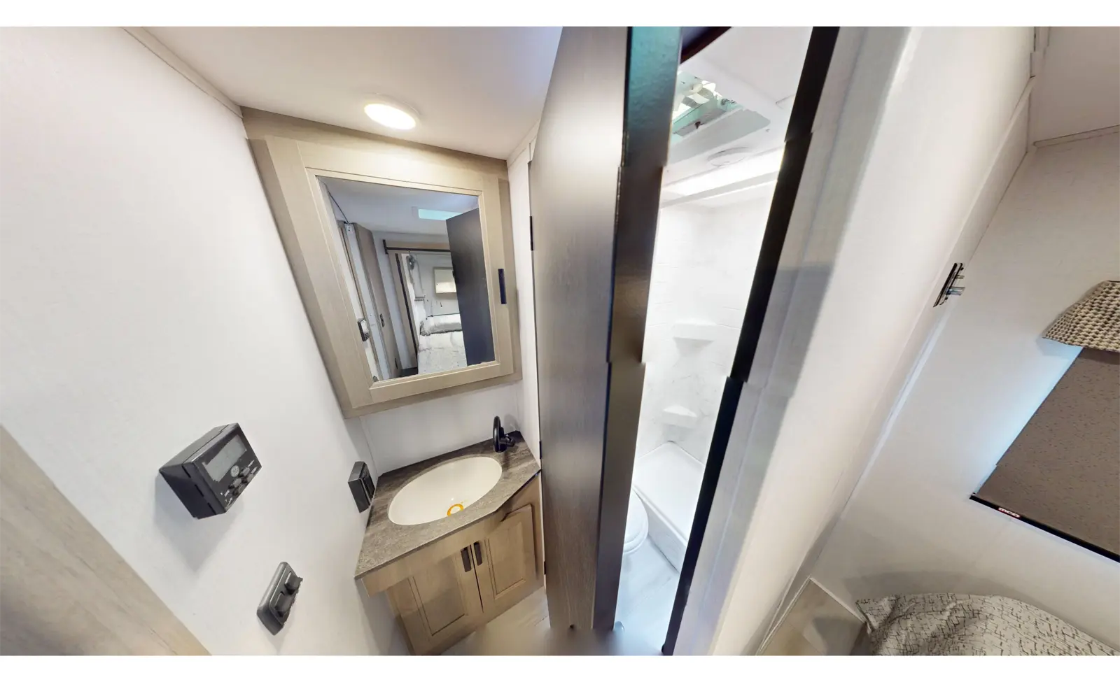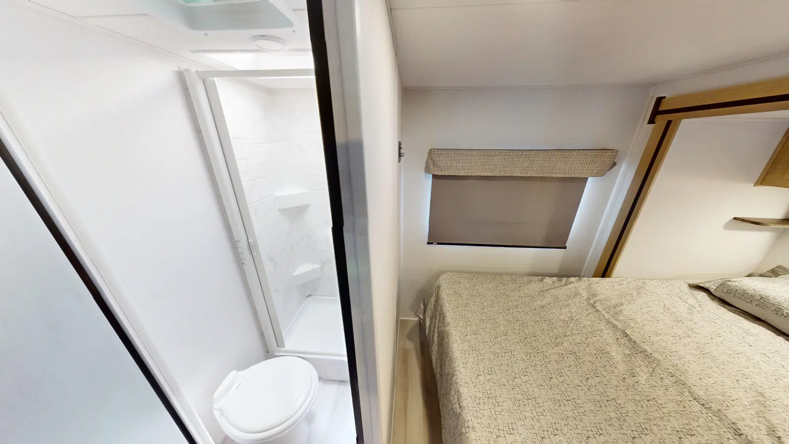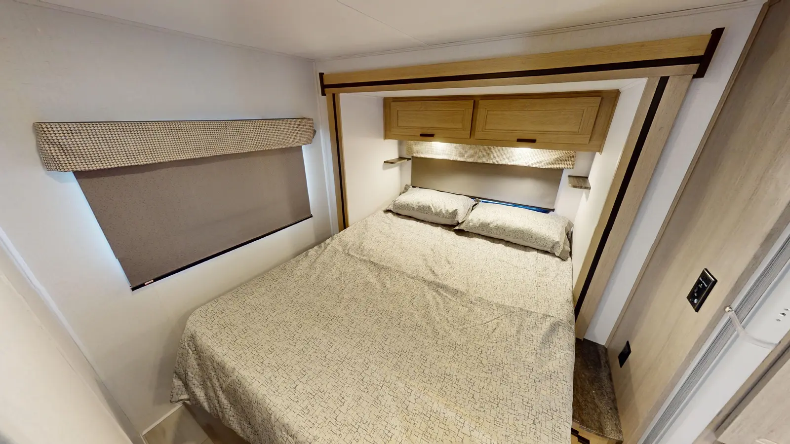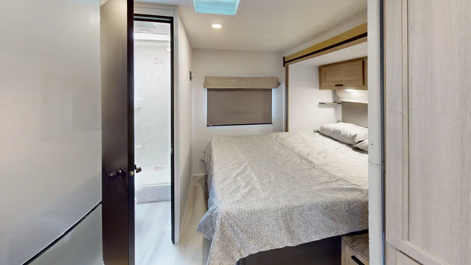 This 2250SLE is built on a Chevy 3500 or Ford E350 chassis. There is a rear bedroom with slideout and a 60" x 80" wedge mattress for enhanced sleep. The main living area includes a kitchen with 12V refrigerator, booth dinette, cooktop, convection microwave, and sink with a flip-up counter extension. In the front, there's a 60" x 80" cab over bunk for sleeping and additional storage.