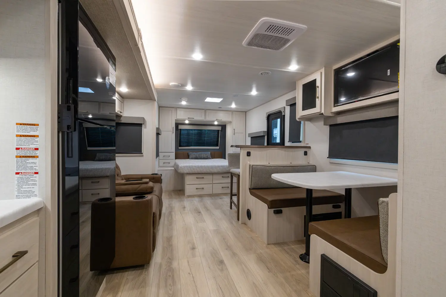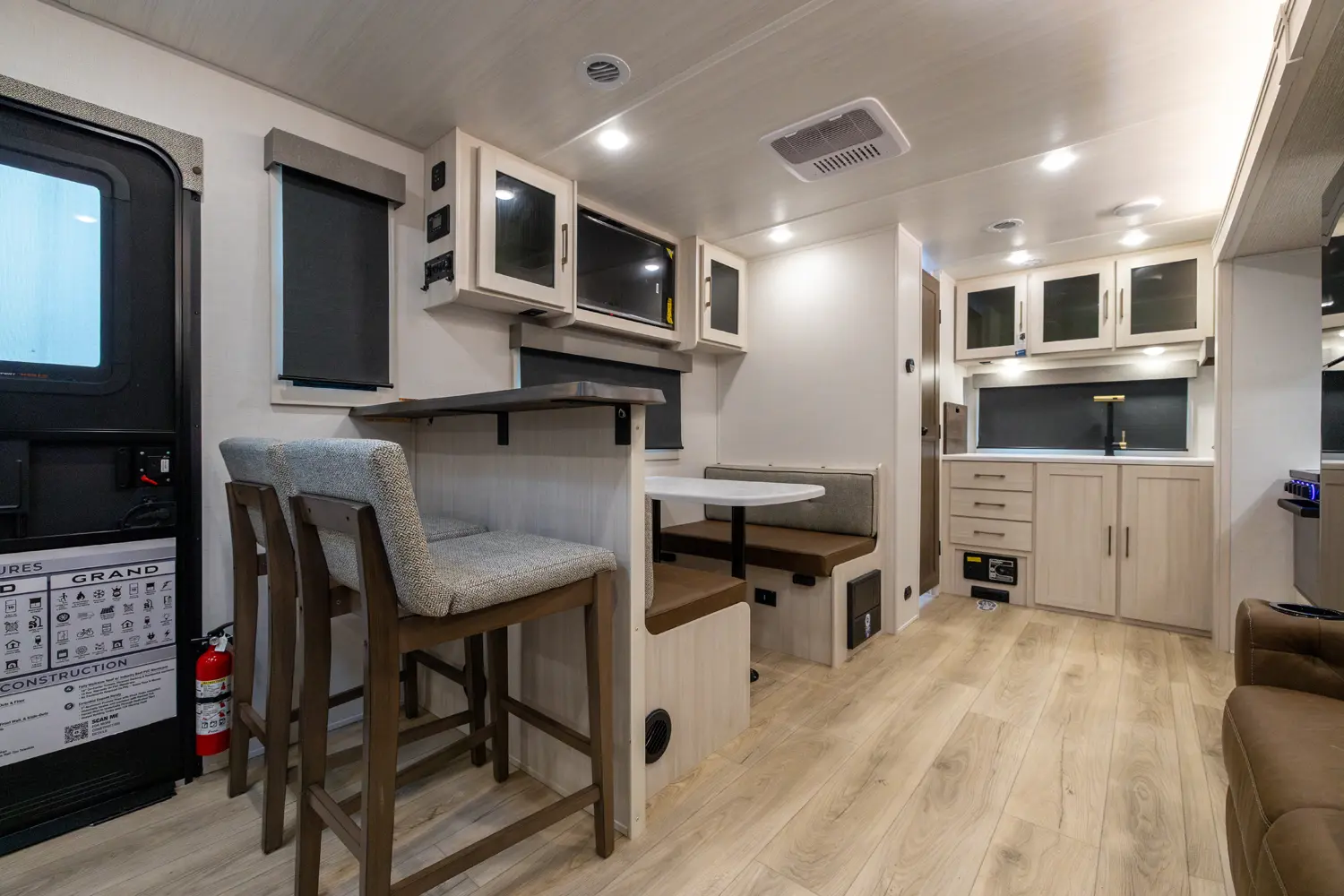 This 27' travel trailer features a front Queen bedroom with dual wardrobes and overhead storage. The kitchen includes a 10 cu. ft. 12V refrigerator and stovetop. Living space includes a sofa and a breakfast bar with two stools. The rear bathroom offers a shower, toilet, and sink. Exterior amenities include an 18' power awning with LED lights and a pass-through storage compartment.