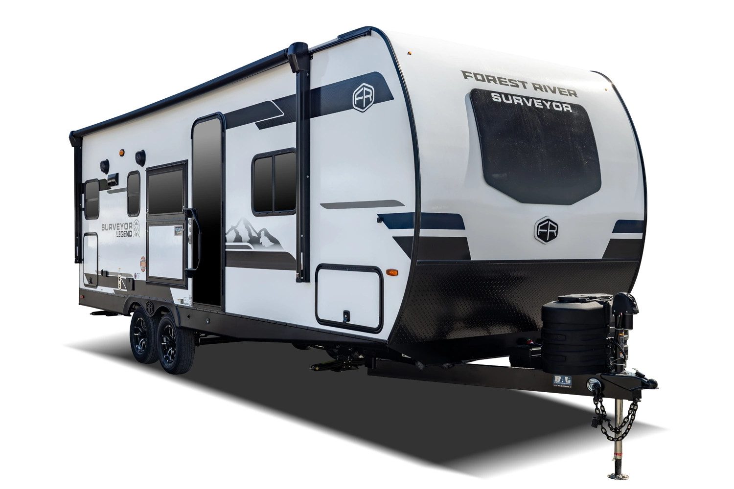 This 27' travel trailer features a rear kitchen with a 10 cu. ft. 12V refrigerator and stovetop. The front private bedroom includes a queen bed with dual wardrobes and overhead storage. The living area offers a tri-fold sofa and a versatile Bar 2 Table feature. Exterior amenities include an 18' power awning with LED lights, TrailGate outdoor bar, and pass-through storage.