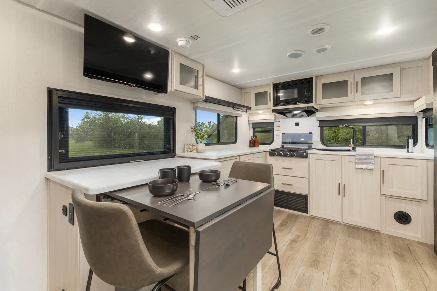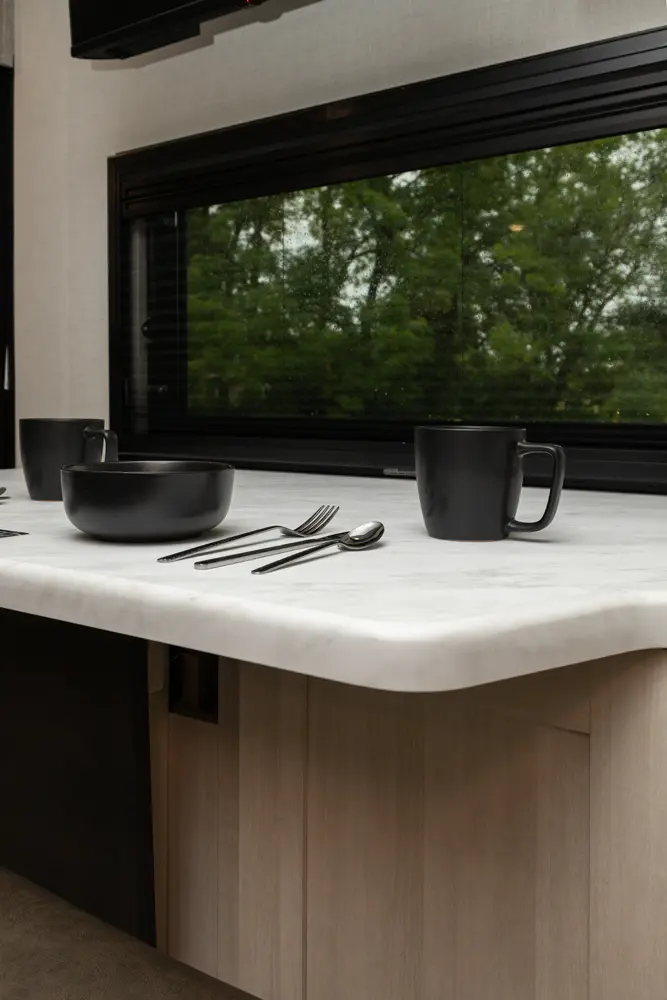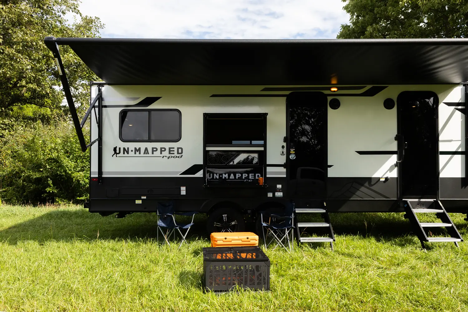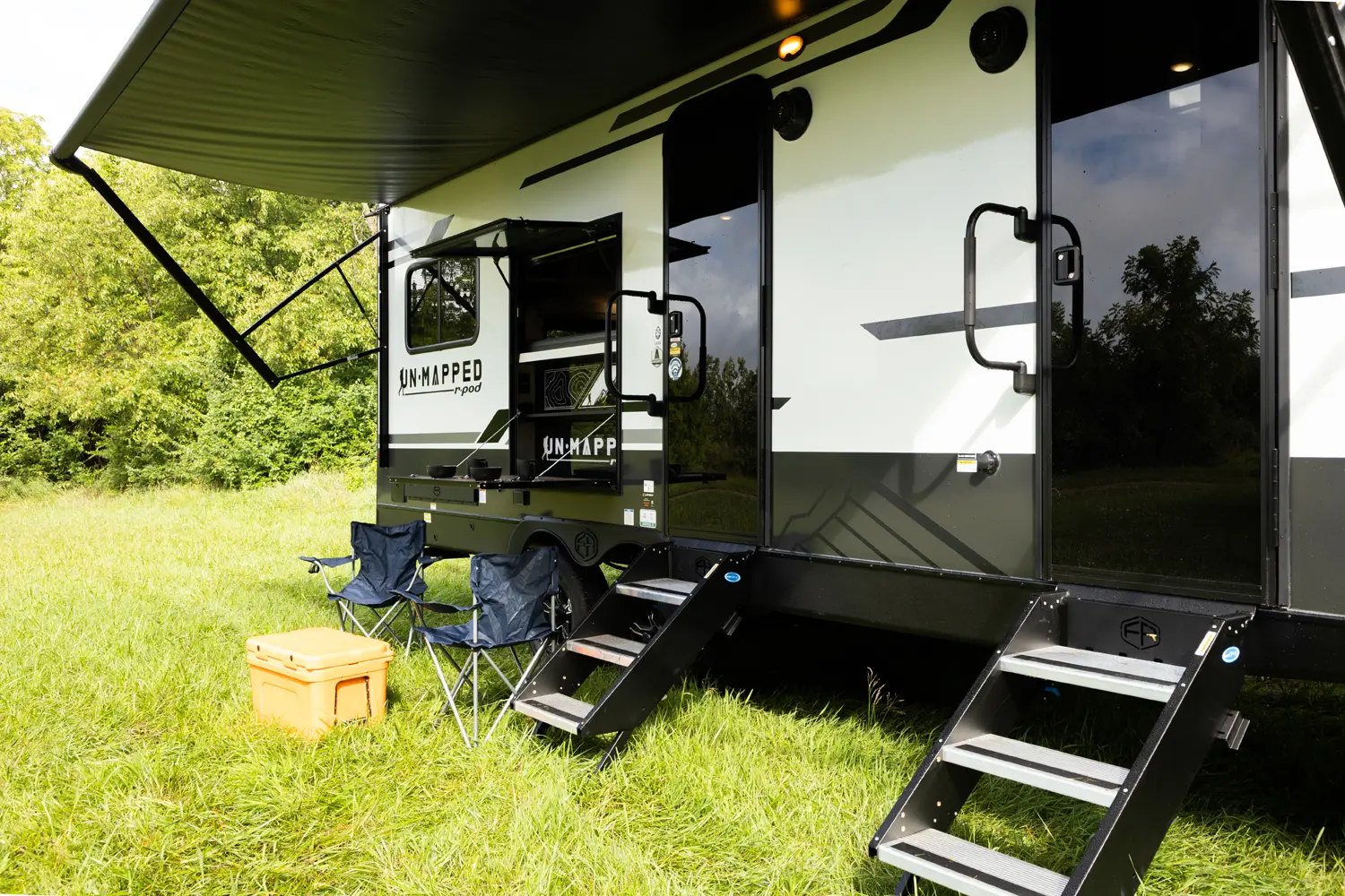 The Un•Mapped 24RK features a rear kitchen layout with a 12V black glass refrigerator, and an air fryer microwave. The Bar2Table pull-out dinette and TrailGate outdoor bar enhance dining flexibility and outdoor entertaining. Inside, enjoy a king bed, 15K A/C, and a tankless on-demand water heater. Exterior amenities include a 21' powered awning and a hot & cold spray port.