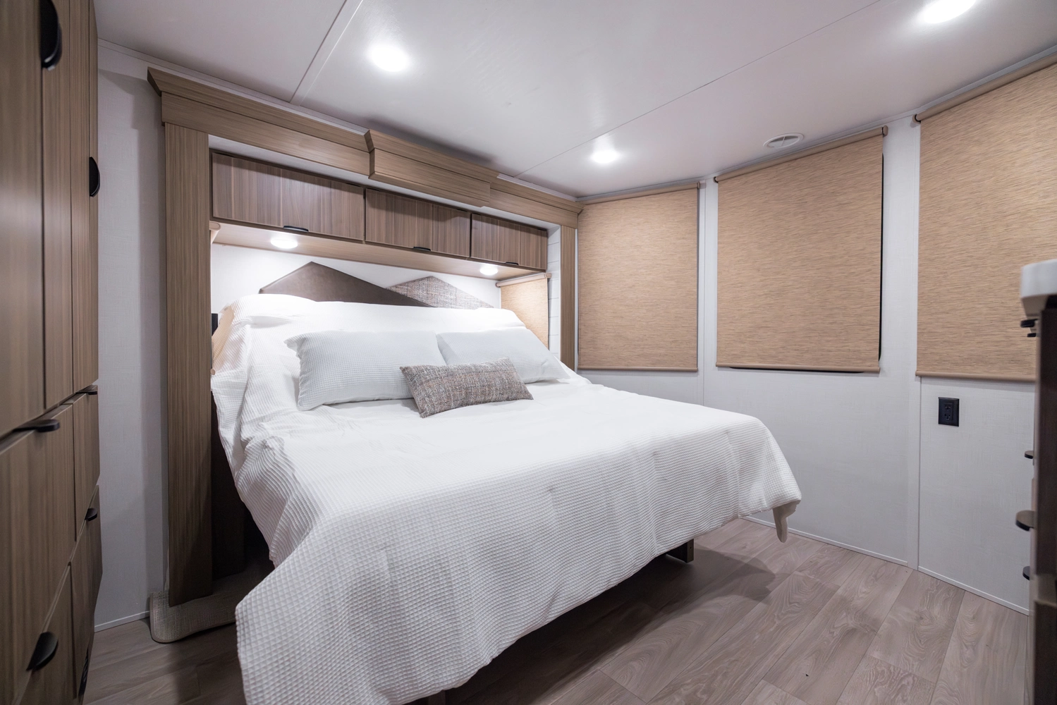 The Wildwood Grand Lodge 42DL is another fantastic double loft destination trailer. In addition to the HUGE double loft bonus room for the kids, there is a front queen bedroom for the adults, plus additional sleep options in the living room. The bathroom includes a walk-in shower with a built-in seat, while the island kitchen provides residential appliances and plenty of room for all the cooking essentials.
