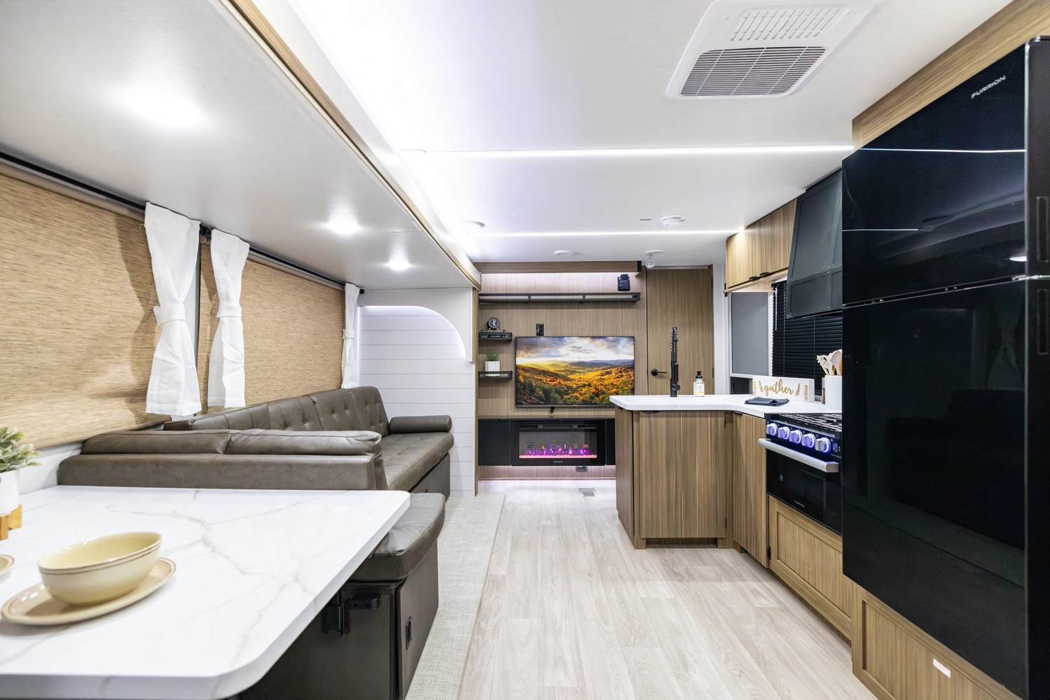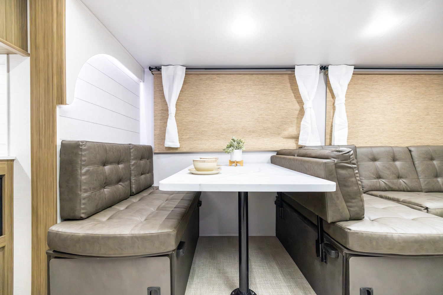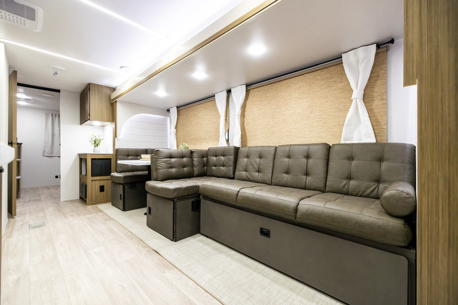 The 32BHDS is the ultimate bunkhouse, with two total slide outs and an outside kitchen. This well-equipped travel trailer features oversized panoramic windows, the ever-popular U-dinette, which you can customize with the adjacent Versa-Lounge. The kitchen includes a 11 CU. FT. refrigerator and stovetop with oven and LED accents, plus cabinets for all your cooking essentials!