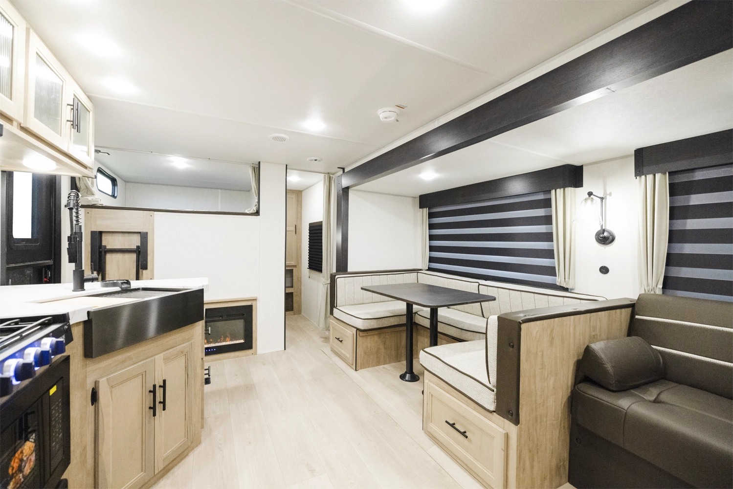 • Cherokee Black Label Wolf Den (Deep Tinted Frameless Automotive Glass Windows, High Gloss Gel Coat Exterior Sidewalls, Multicolor Reading Lights, Pillowtop Mattress Upgrade, Solid Surface Countertops, Thermo Foil Arctic Insulation)